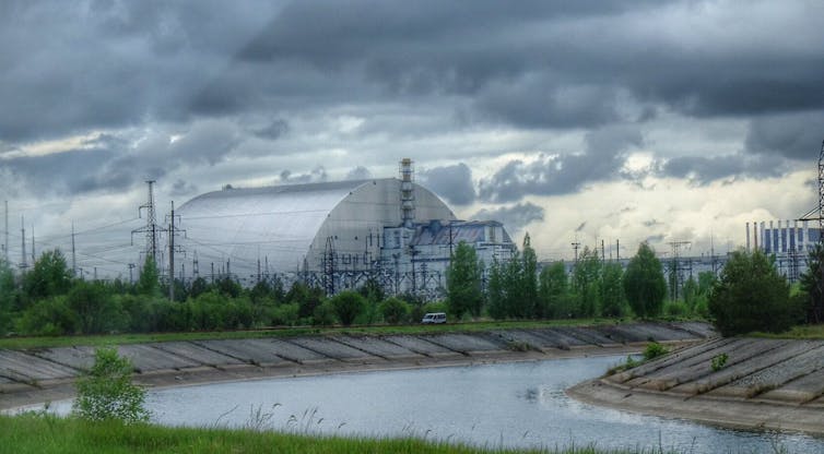 Vue de la centrale nucléaire de Tchernobyl, en Ukraine, prise le 4 mai 2017, et du bâtiment de confinement installé sur le réacteur numéro 4. Photo : fournie par l’auteur